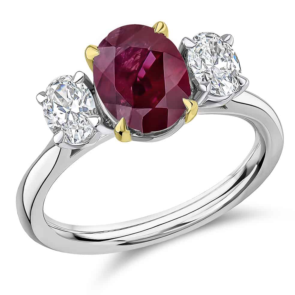 Ruby and Diamond Oval Cut Trilogy Engagement Ring