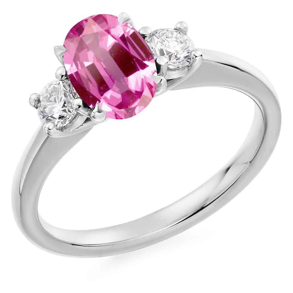 Pink Sapphire and Diamond Oval Cut Trilogy Engagement Ring