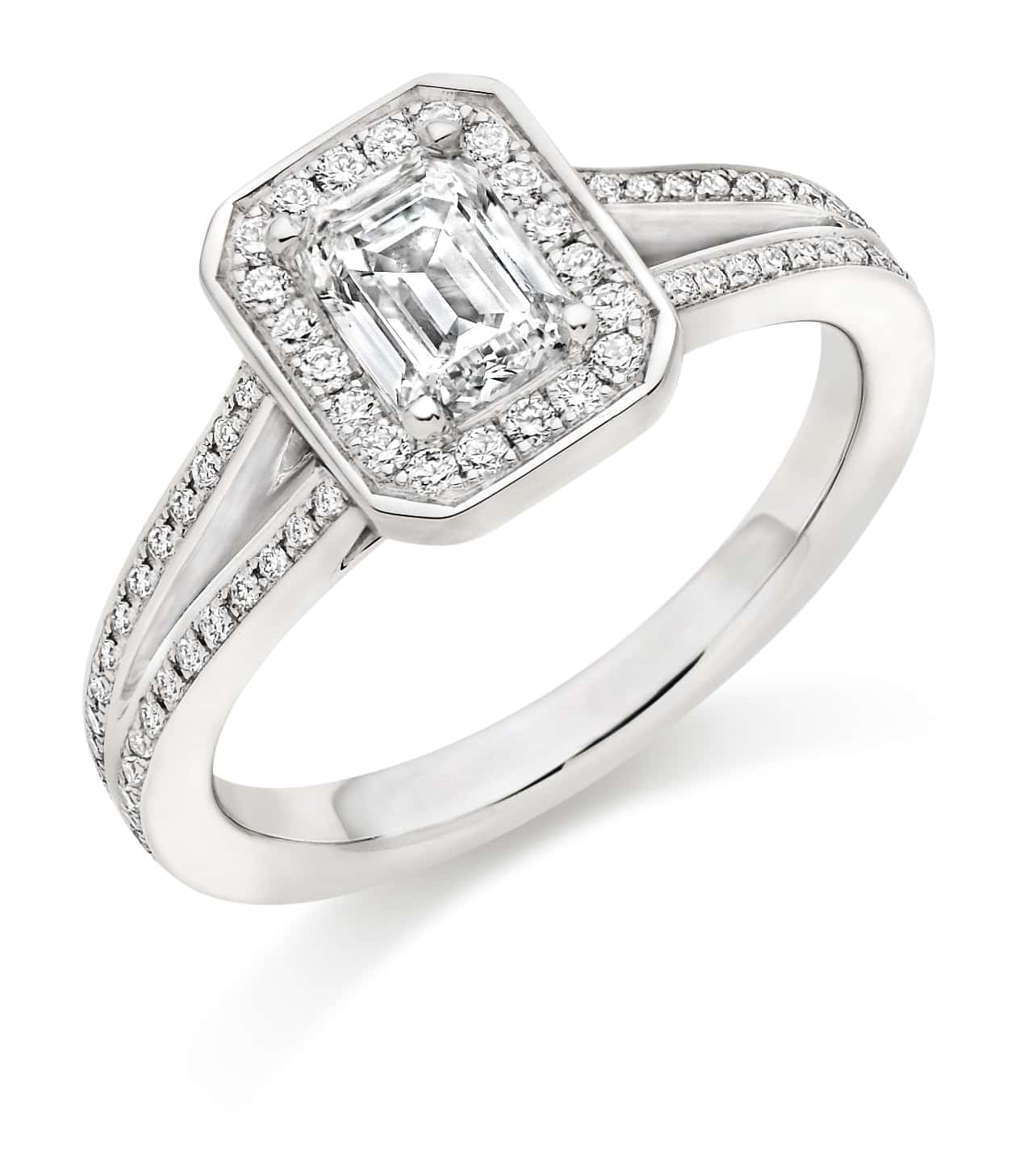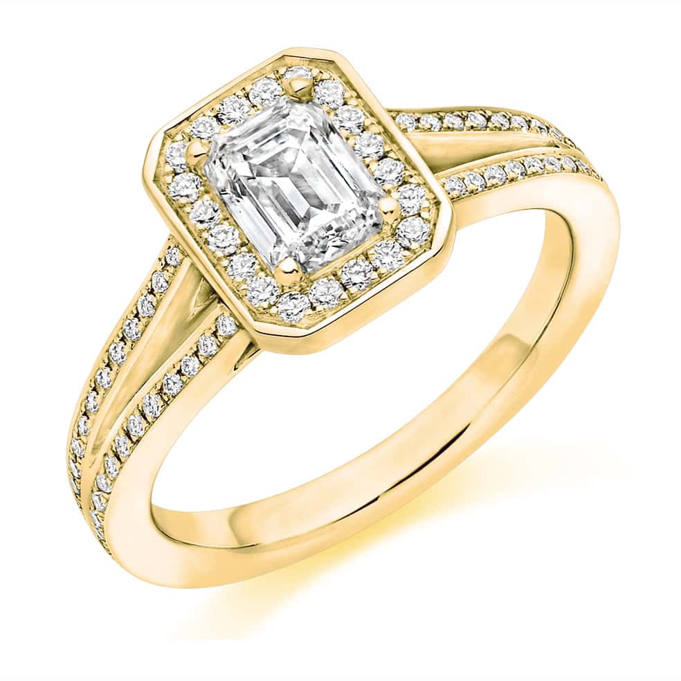 Emerald Cut Halo 1ct Diamond Engagement Ring with Diamond Set Shoulders