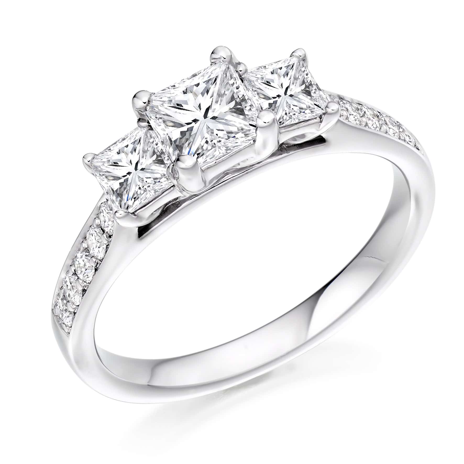 Princess Cut Trilogy Diamond Engagement Ring with Diamond Set Shoulders