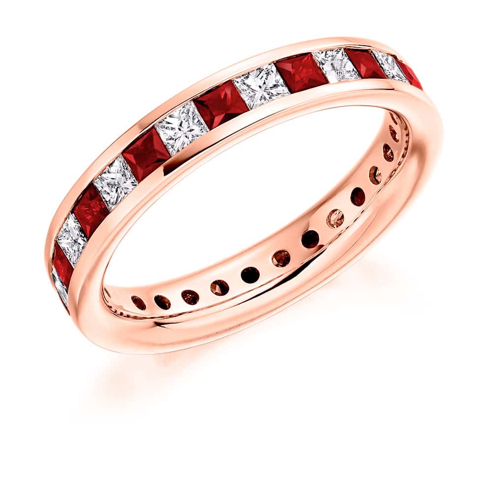 Ruby and Diamond Princess Cut Channel Set Full Eternity Ring with 100% Diamond Coverage